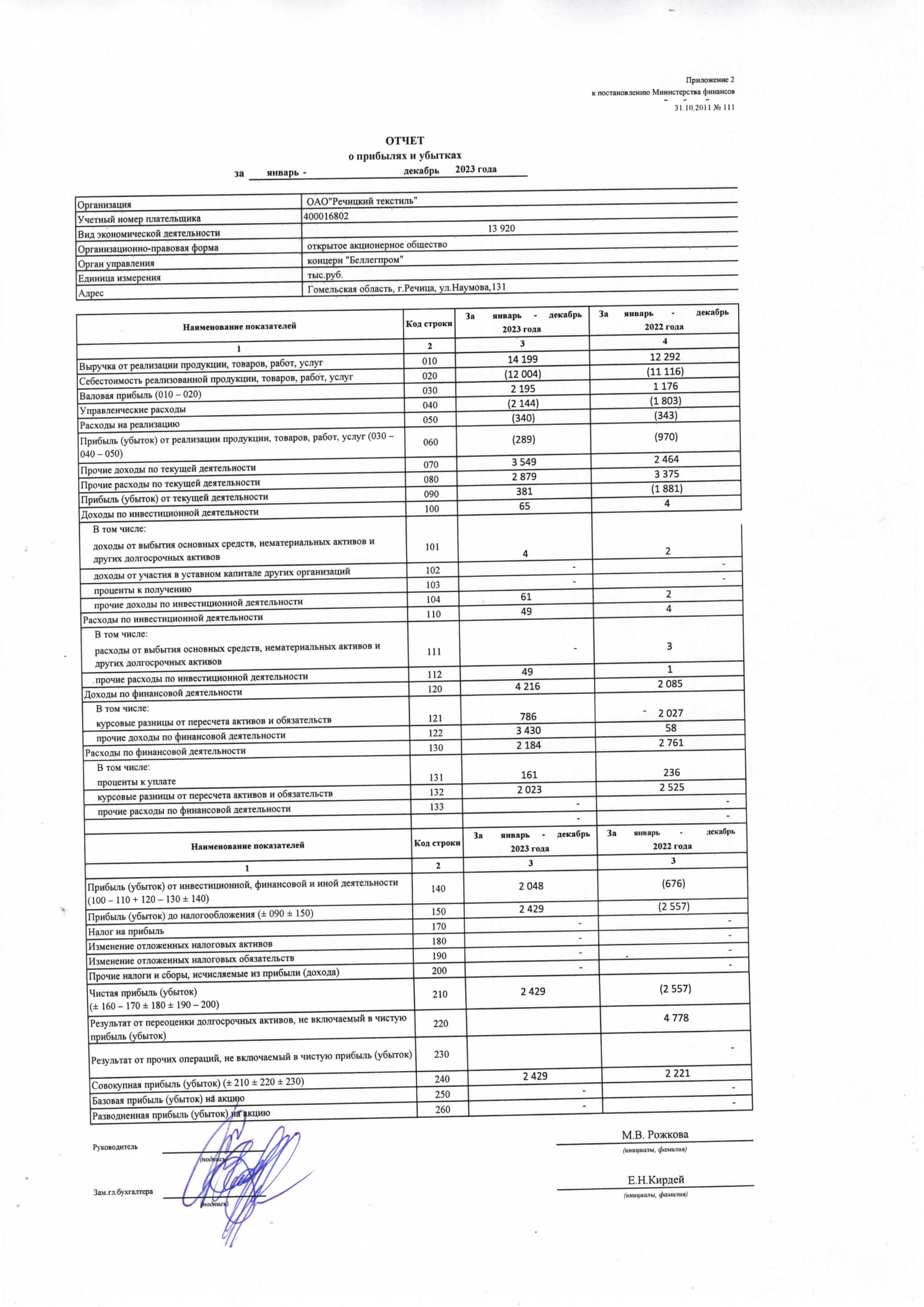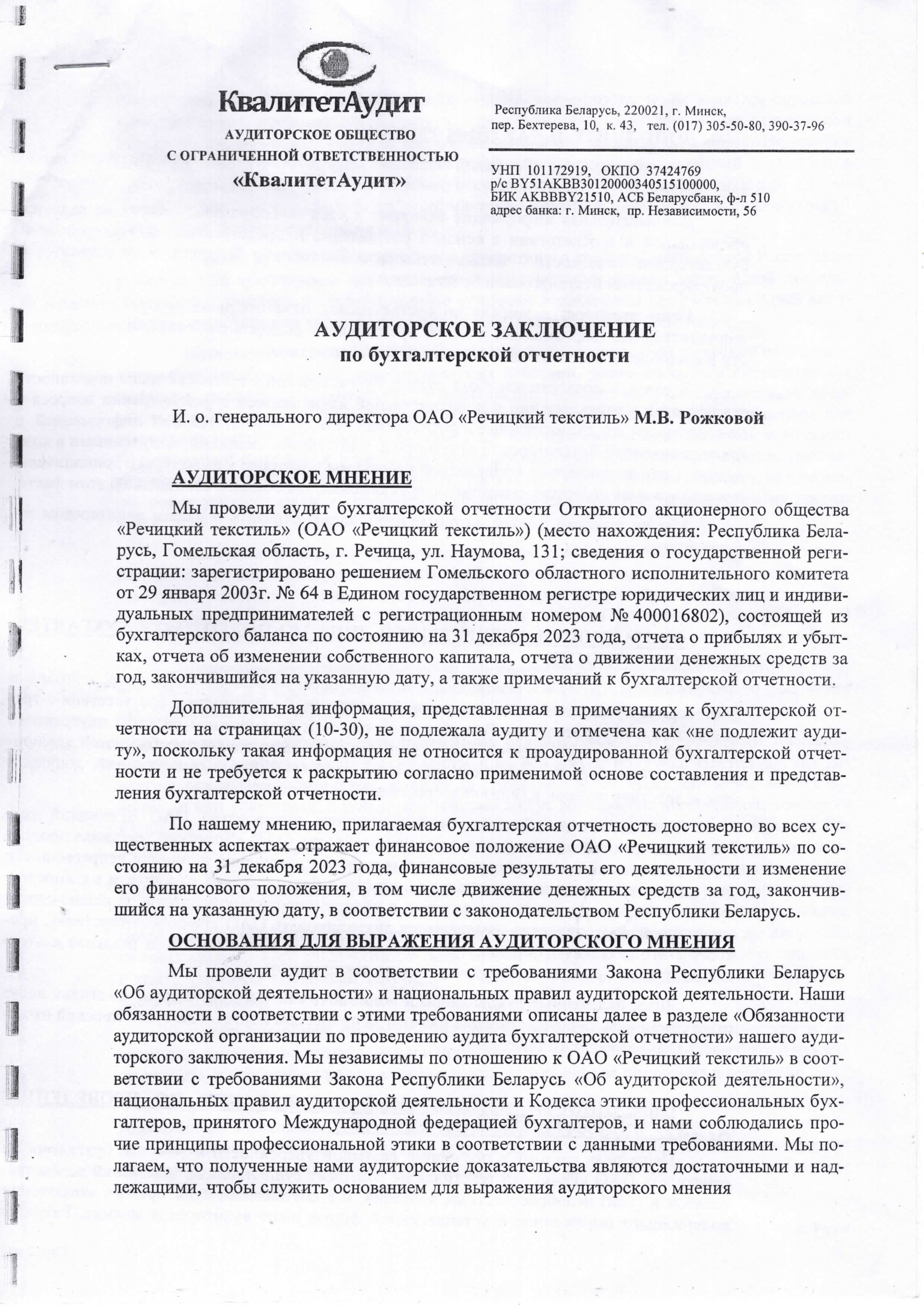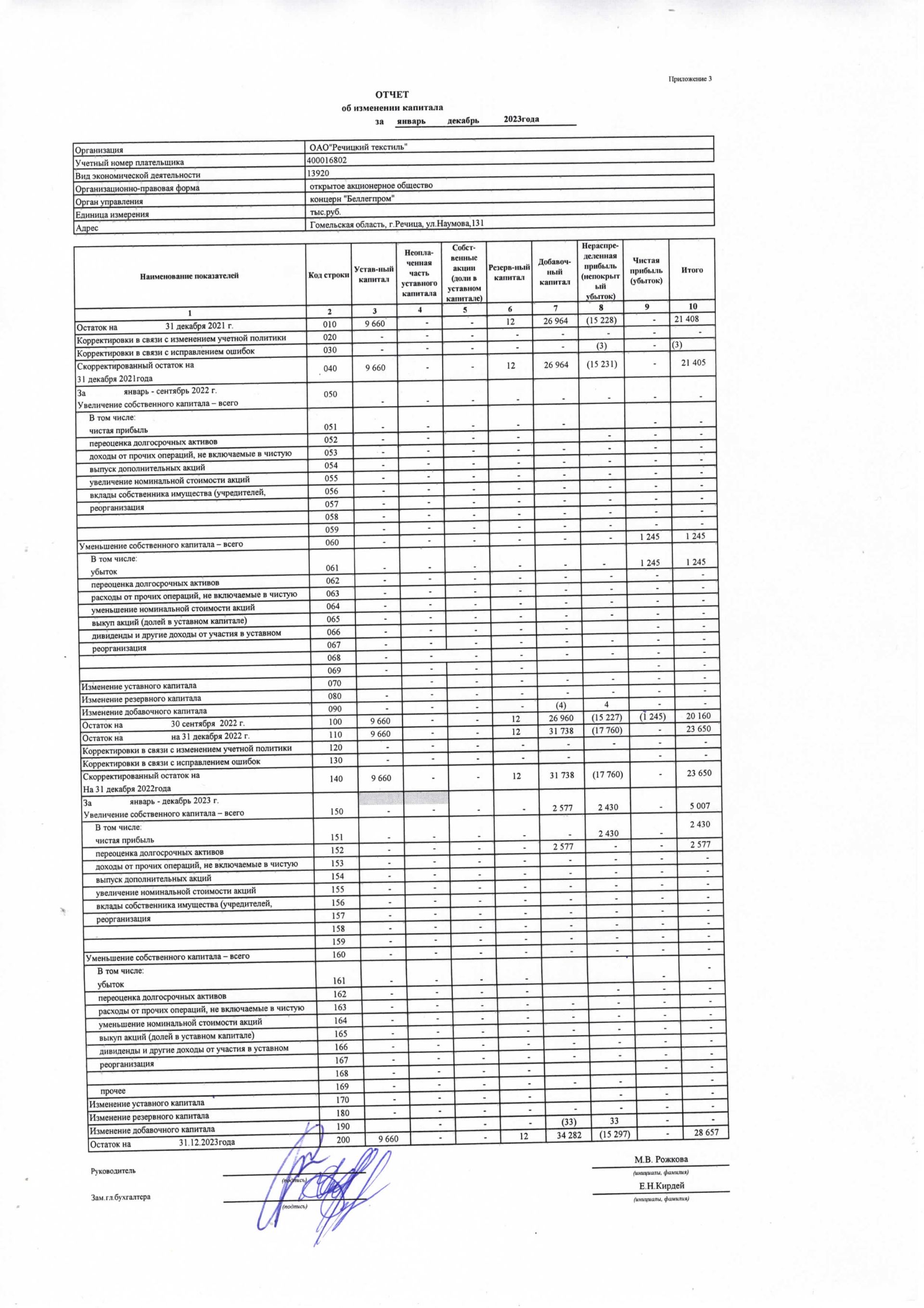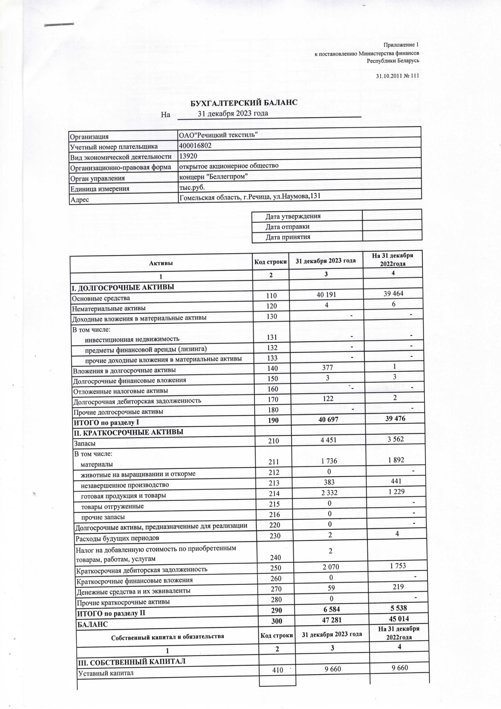 Годовая отчетность ОАО "Речицкий текстиль" на 01.01.2024