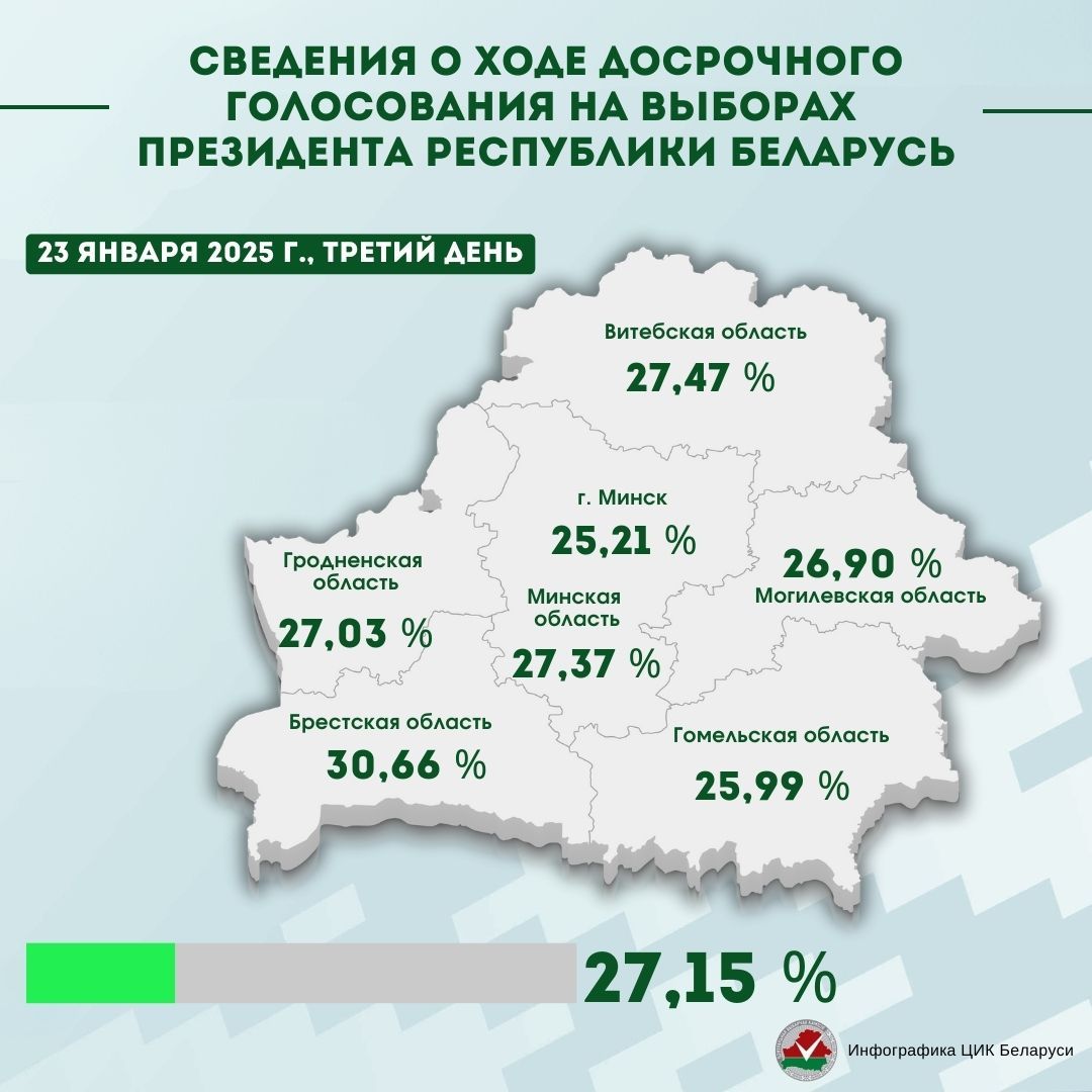 ✔️ За три дня в досрочном голосовании на выборах Президента Республики Беларусь приняло участие 27,15 % от общего числа граждан, включенных в списки для голосования.